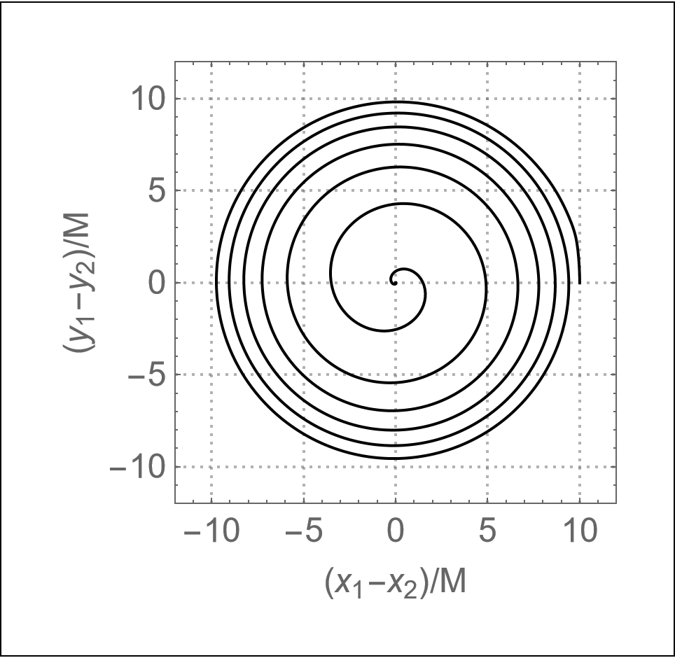 Coordinate tracks of the centroids of the apparent horizons showing inspiral of the binary due to emission of energy and angular momentum in gravitational waves. Follow the plots tutorial to generate this.