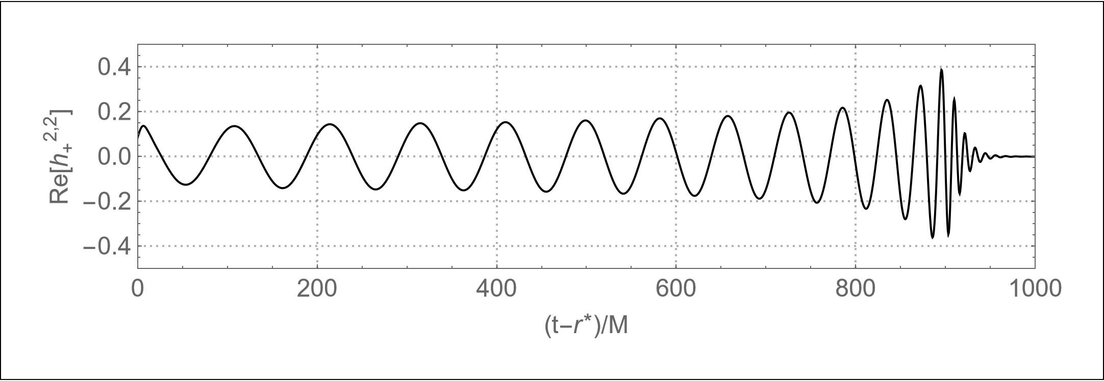 The l=2, m=2 spherical harmonic mode of the gravitational wave strain. The strain is what is measured by LIGO. Follow the plots tutorial to generate this.